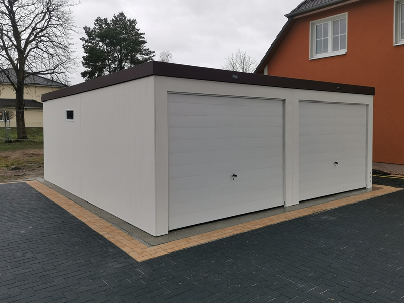 Die verputzte Doppelgaragen von garagenonline.eu werden aus verzinkten Paneelen hergestellt, die durch Clinchen verbunden sind und mit Strukturputz außen fertiggestelt sind.