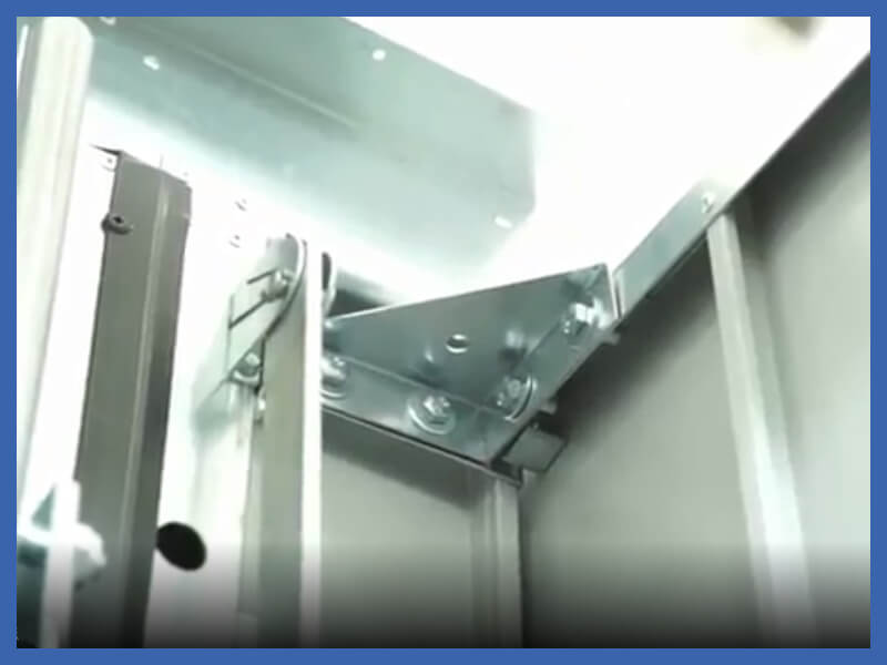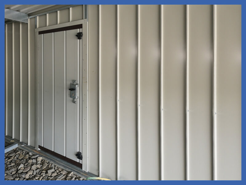 Zweiflügeltor, ohne Schwelle mit einem Bürstensystem, mit Verkleidung aus horizontalen, schmalen Trapezblech.