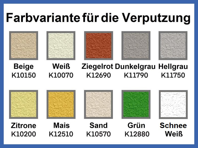 – unsere verputzte Fertiggaragen sind mit Deckputz von Firma KABE (mit Körnung 1,5 mm) für Außenanwendung von Außen auf verzinktem 0,5 mm Blech flach verputzt.