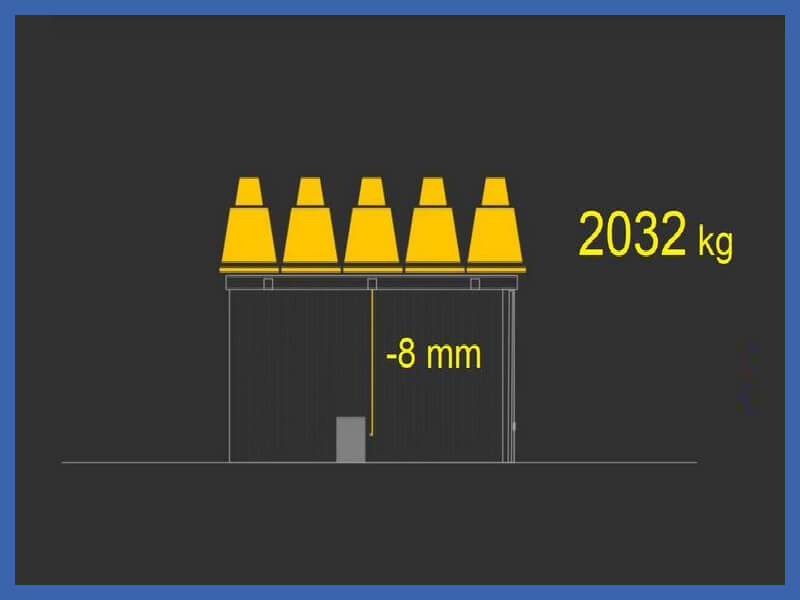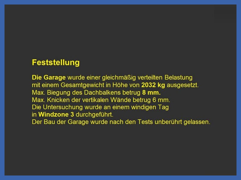 Die Fertiggarage wurde einer gleichmäßig verteilten Belastung mit einem Gesamtgewicht in Höhe von 2032 kg ausgesetzt.