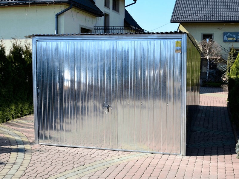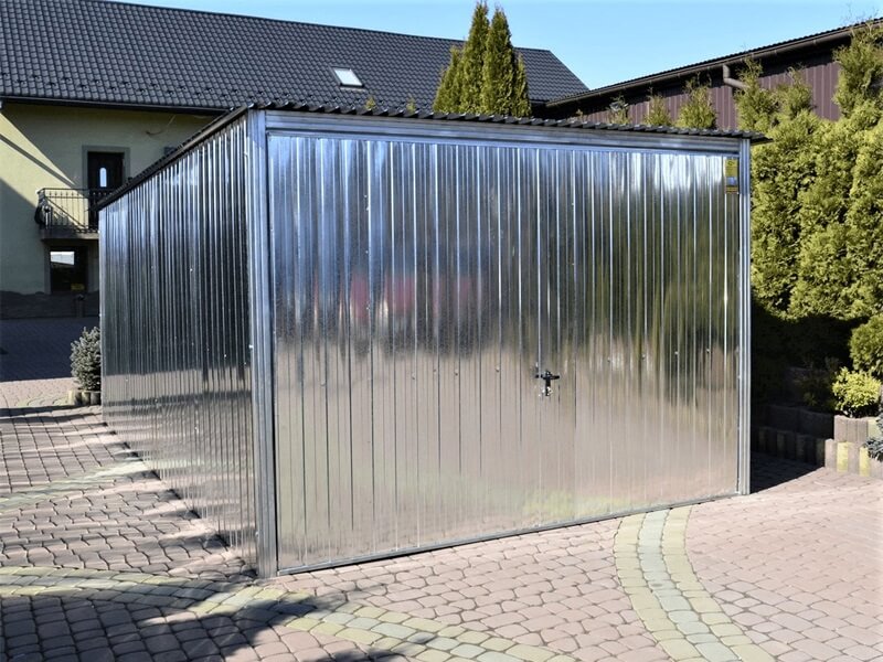 Fertiggarage Verzinkt mit Schwingtor und mit Flachdach ( Pultdach) Neigung nach hinten.