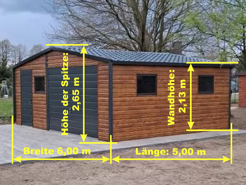 GARAGENMAßE: Breite: 6,00 m, Höhe Wände 2,13 m / Höhe der Spitze 2,65 m, Länge 5,00 m