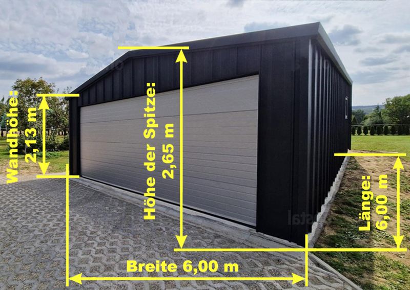 GARAGENMAßE: Breite: 6,00 m, Höhe Wände 2,23 m / Höhe der Spitze 2,75 m, Länge 6,00 m